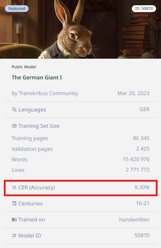 If you're browsing models on Transkribus, you will see that each model has a Character Error Rate, or CER. This is a score that shows the accuracy of that model: The lower the CER of a model, the more likely that model is to produce accurate transcriptions.
