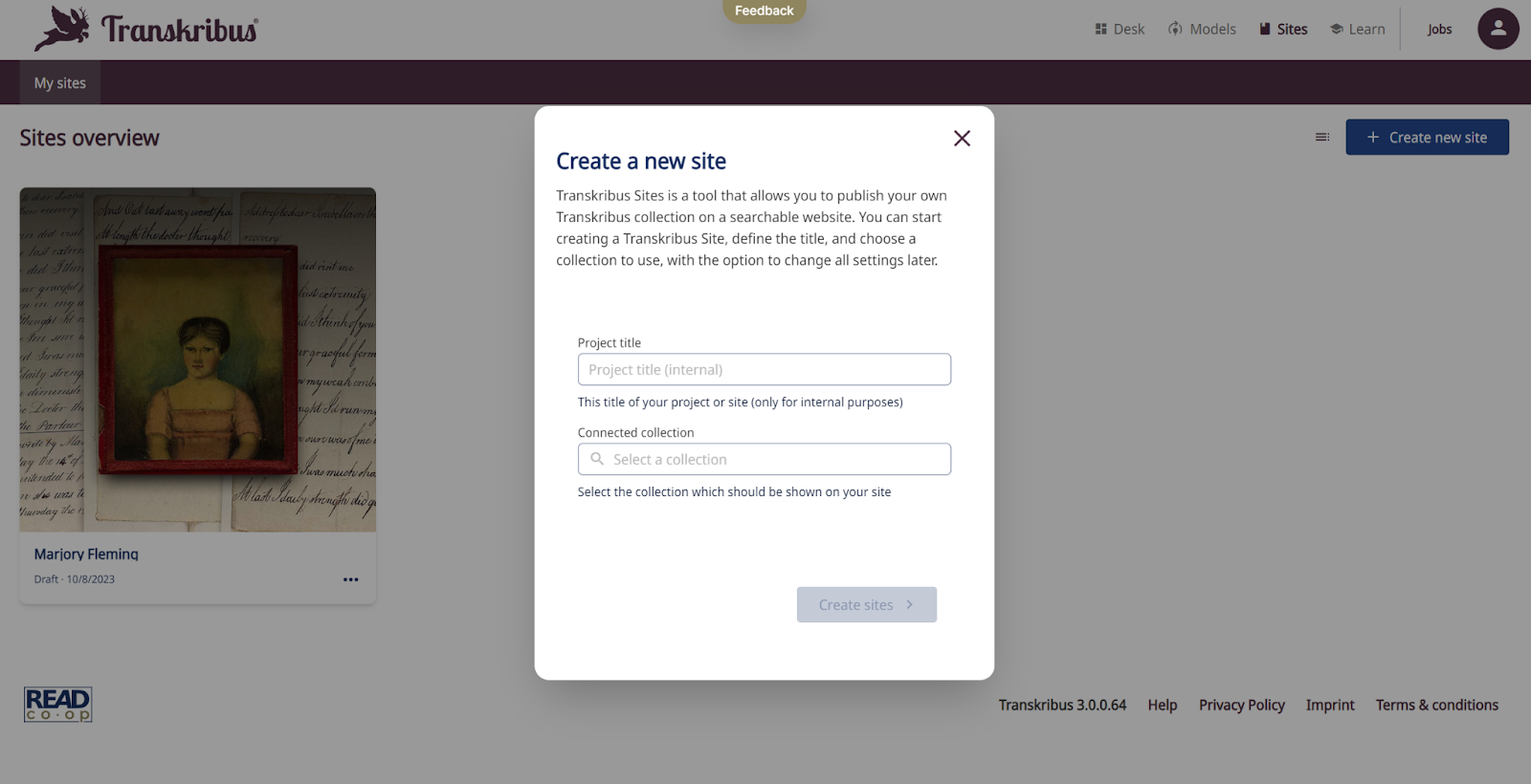 - Name your project, add your collection and start building. Personalise your Transkribus Sites with your favourite theme and enjoy the flexibility to adjust settings as you like.