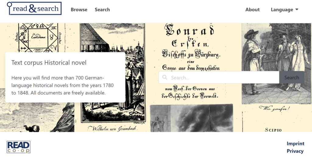 read&search is an easy-to use platform which allows you to publish documents directly from Transkribus. You can simply choose which collections you wish to publish and our team will set up a fully searchable database of those collections. This allows users to quickly search for the information they specifically need, without having to search through the collection. Several printed book collections have been published on read&search, including the NOSCEMUS collection of scientific texts and this collection of historical novels in German.