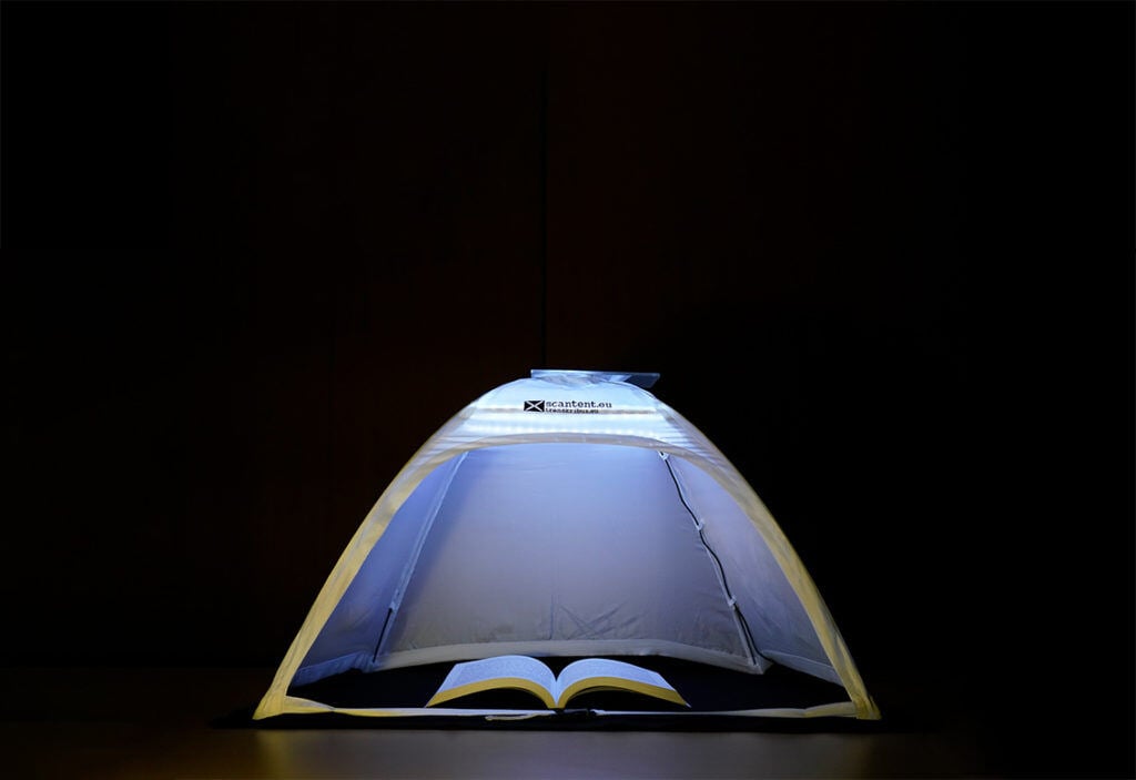 If you are using the latter method, you could consider using the ScanTent. This innovative product provides the optimal lighting environment for making high-quality images of books and documents. You simply place the material you want to scan in the tent, attach your smartphone to the mount on the top and take an image in the same way as normal.