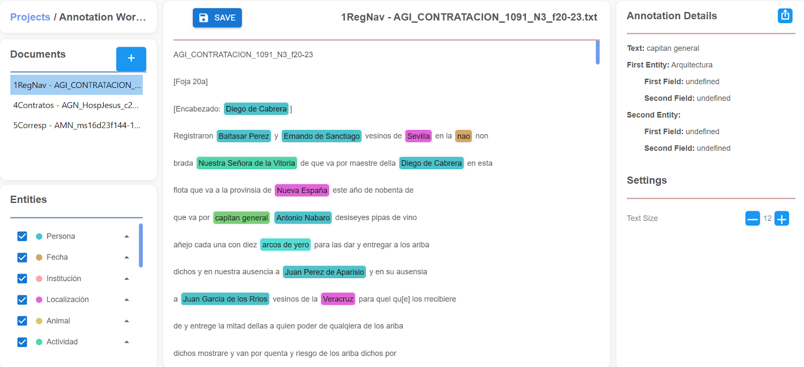 Like in many research projects of this type, transcription was just the start of the digital process. “[We] developed a comprehensive automated annotation system using Named Entity Recognition and Disambiguation (NERD),” Patricia explained. “Using machine learning, we trained models to automatically identify and classify words [...], adapting neural networks with word-embedding algorithms to handle the pre-modern Castilian syntax and the frequent presence of Indigenous language terms.”